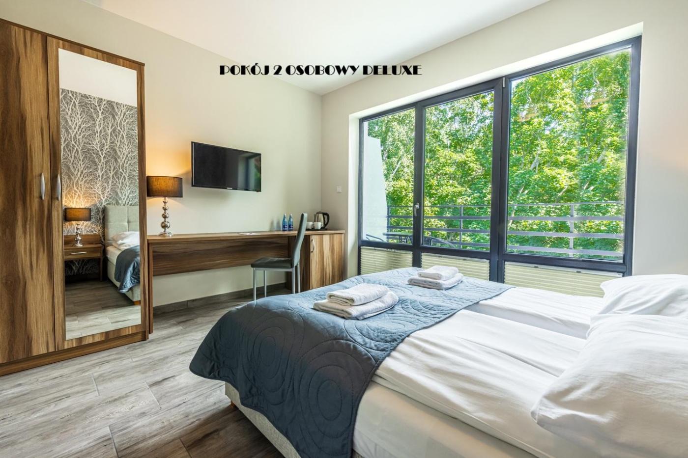 Pokój Dwuosobowy typu Deluxe. The double room features a private entrance, a tea and coffee maker, as well as a private bathroom boasting a walk-in shower and a hairdryer. This double room has a wardrobe, a tiled floor, a flat-screen TV and an outdoor dining area. The unit has 1 bed. Pokój Dwuosobowy - 2 osobowy. Powierzchnia pokoju ok.: 15 mkw. ;
